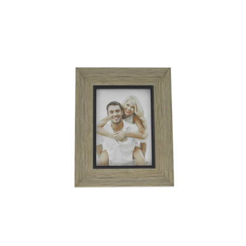 Der Fotorahmen ist mit heller Holzoptik  und auf beim Foto mit schwarzer Kunststoff-Umrandung.