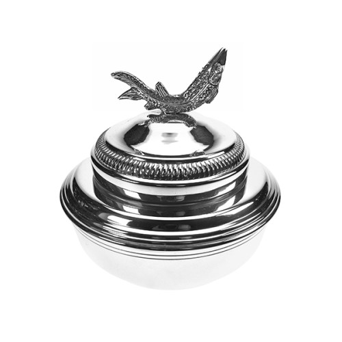 Versilberte Schale und Deckel mit Störapplikation, Glas für 125 Kaviar geeignet.